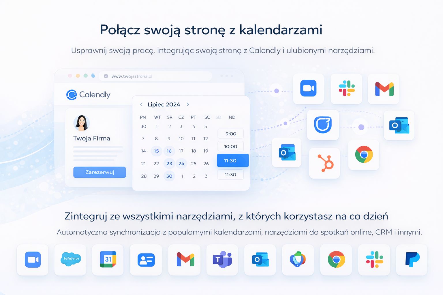 Strona24.pl to kreator stron www, który pozwala szybko stworzyć nowoczesną stronę bez znajomości programowania i posiada moduł integracji z Calendly. Calendly to narzędzie do automatycznego umawiania spotkań online, które synchronizuje się z Twoim kalendarzem i ułatwia zarządzanie dostępnością.