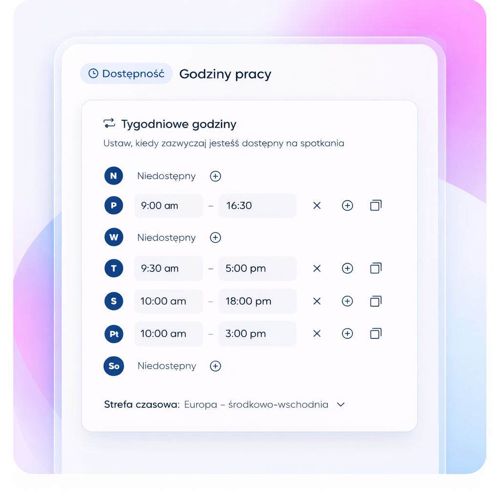 Poinformuj zaproszone osoby, kiedy jesteś dostępny. Zyskaj pełną kontrolę nad swoim kalendarzem dzięki precyzyjnym ustawieniom dostępności, zasadom planowania, buforom czasowym i wielu innym funkcjom.